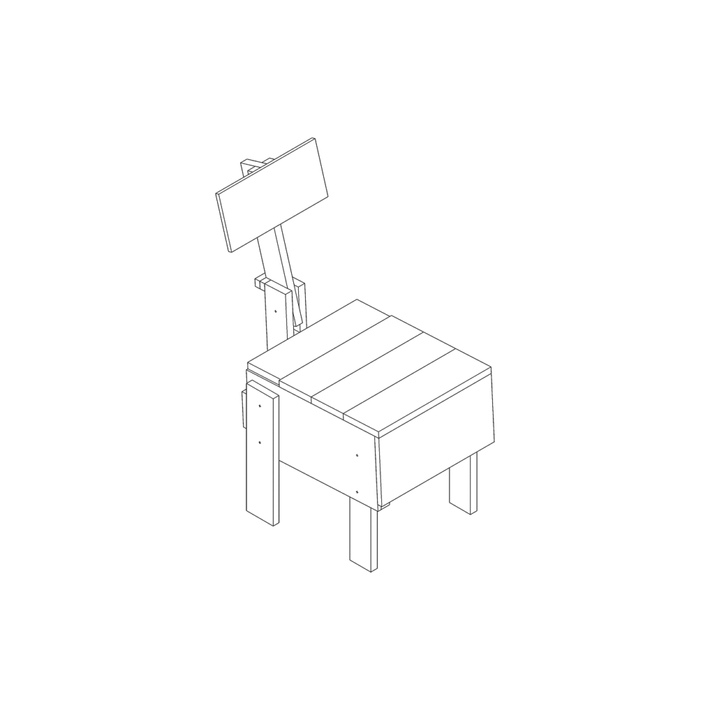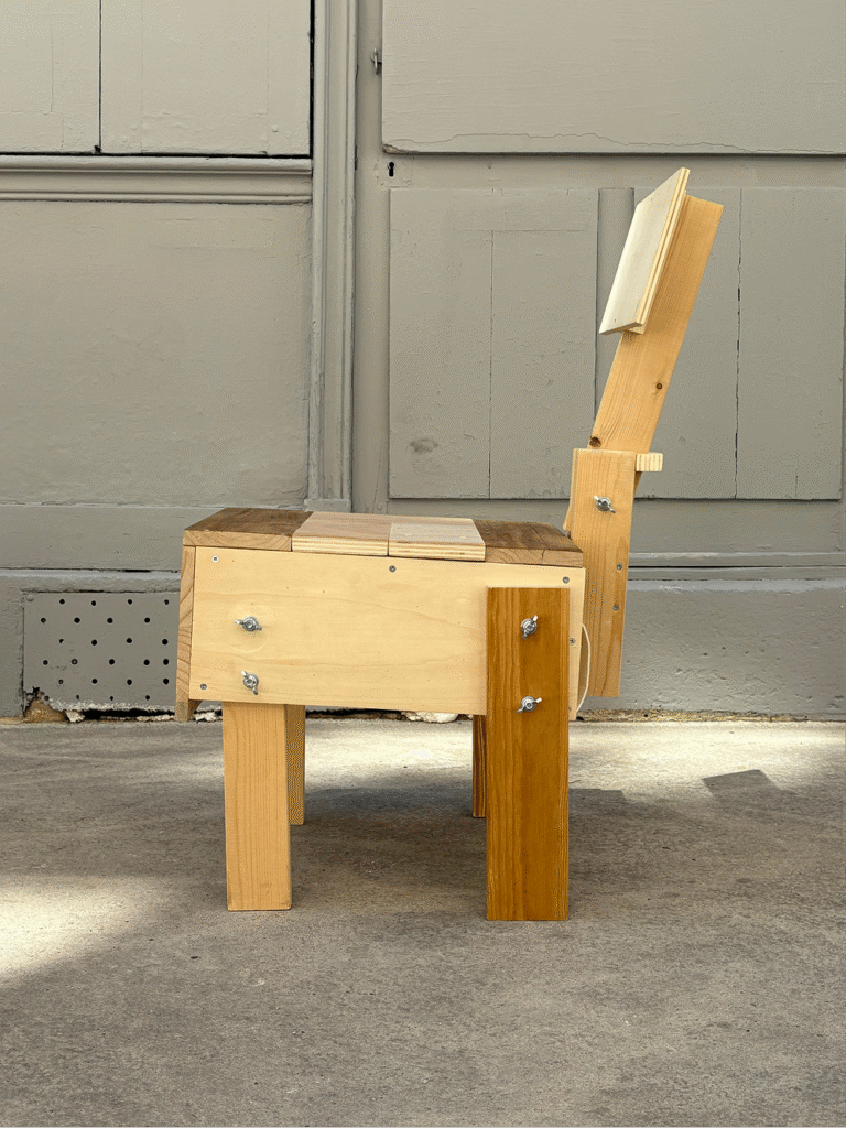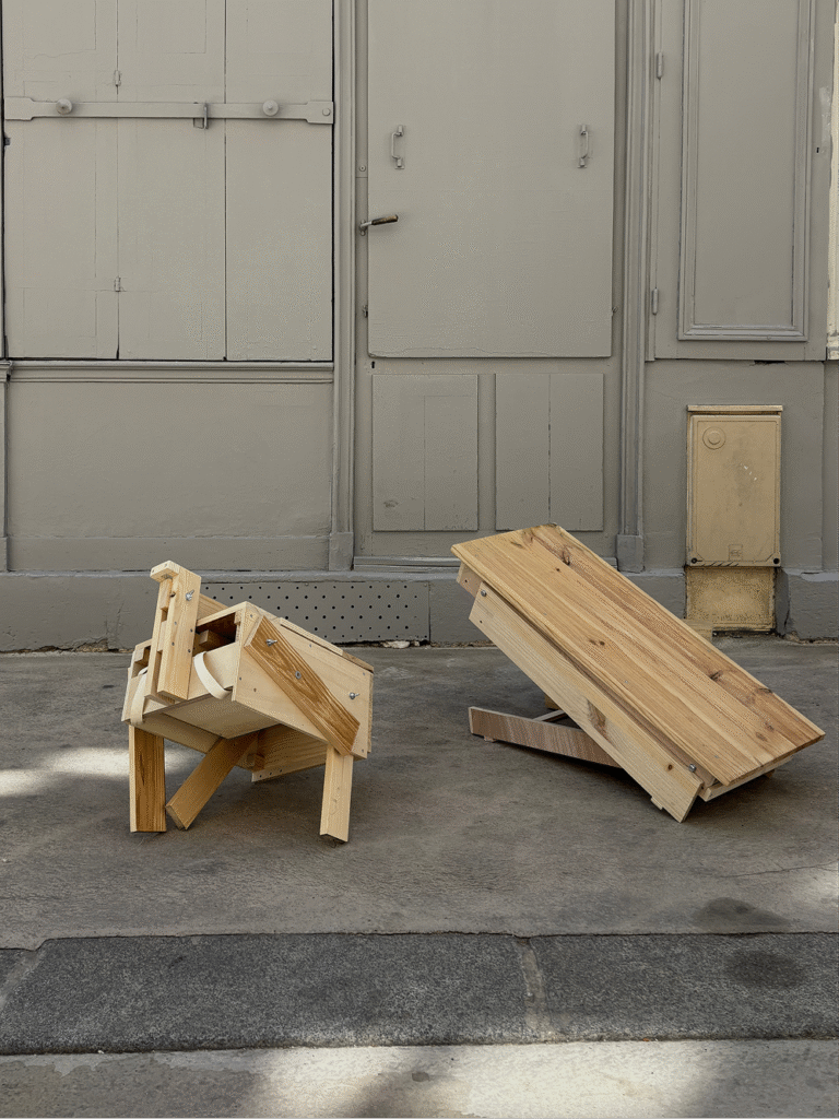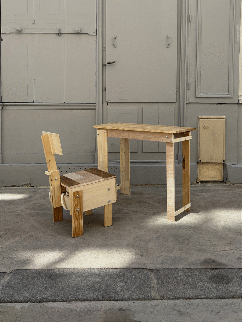 Animaux mécaniques, cette table et cette chaise constituent les premiers objets fabriqués à dimensions «normées». Ces objets naissent des chutes de bois restantes des autres projets, qui viennent s’articuler pour prendre vie dans l’espace public.