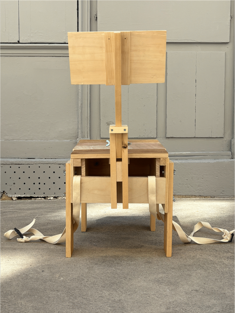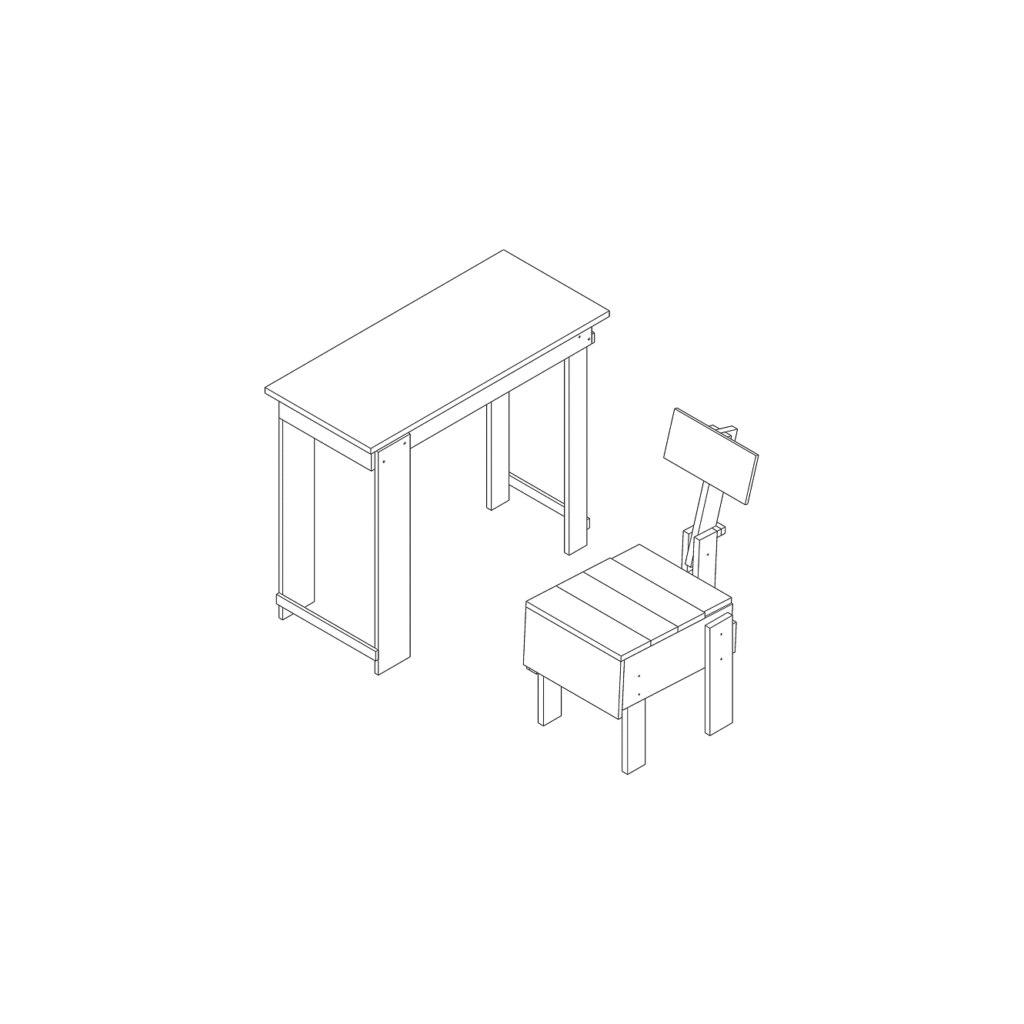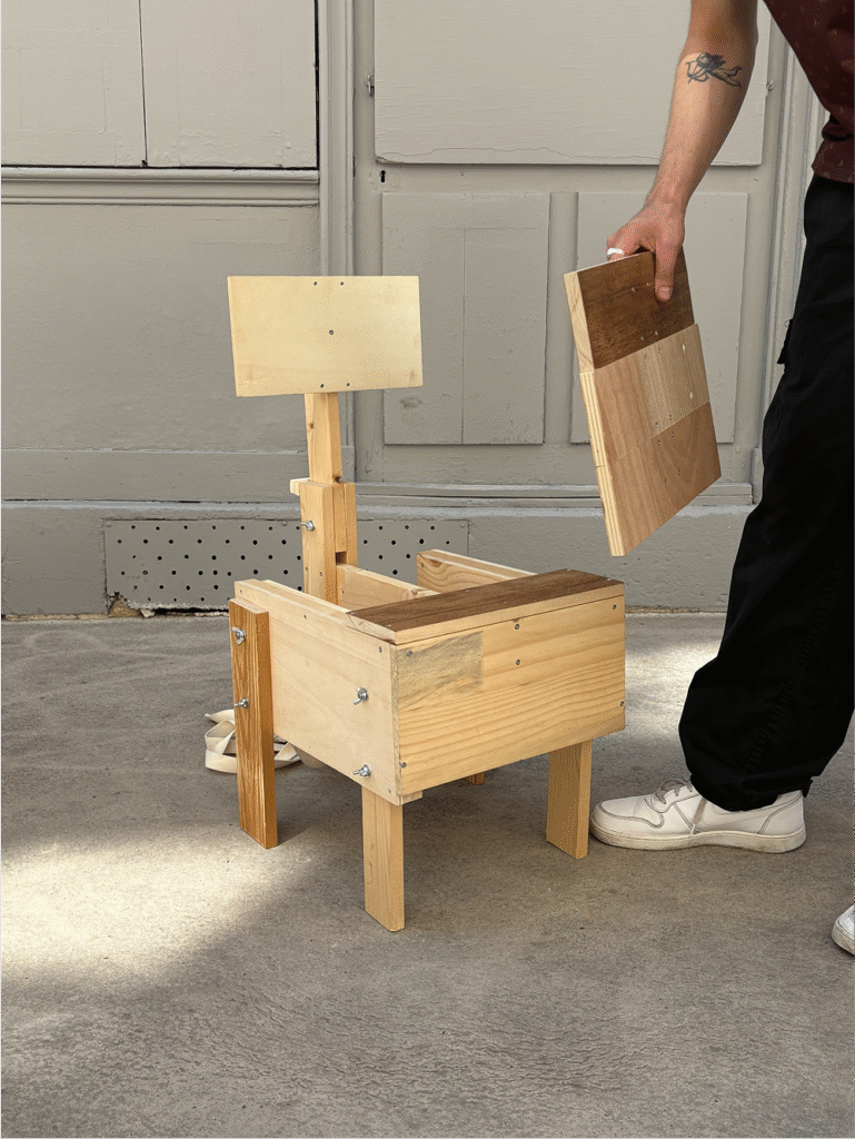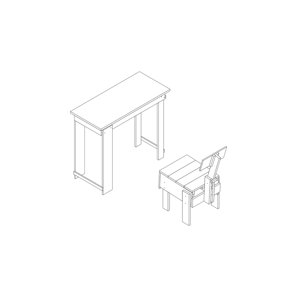 Animaux mécaniques, cette table et cette chaise constituent les premiers objets fabriqués à dimensions «normées». Ces objets naissent des chutes de bois restantes des autres projets, qui viennent s’articuler pour prendre vie dans l’espace public.