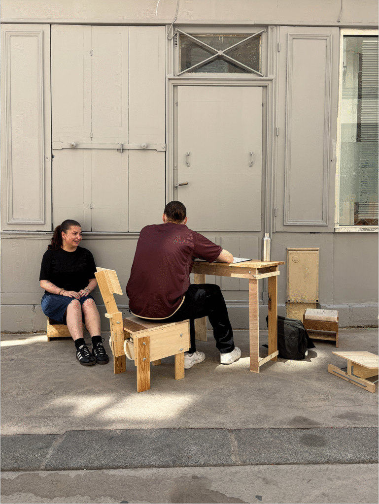 Il se base sur l’utilisation et le déploiement de mobilier nomade, conçu et fabriqué à partir de matériaux collectés dans les rues. Une fois transformés en outils de traversée urbaine (chaises, tabourets, tables…), ce mobilier est colporté et installé spontanément à travers la ville. Comme remis en circulation, ces matériaux abandonnés dans nos rues deviennent le support de «situations» insufflant spontanéité et ralentissement dans notre pratique de l’espace public. Ces situations sont l’occasion de créer des rencontres, des fragments de mémoire, et de sensibiliser à une pratique du design à échelle humaine.